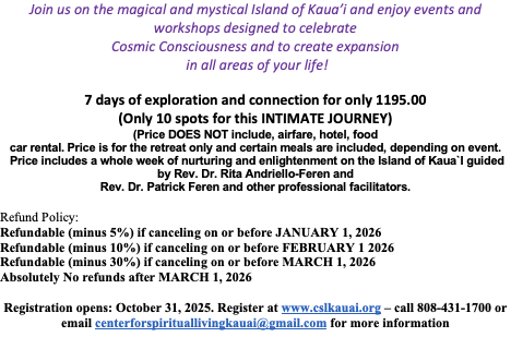 Registration opens: October 31, 2025. Register at www.cslkauai.org – call 808-431-1700 or email centerforspirituallivingkauai@gmail.com for more information