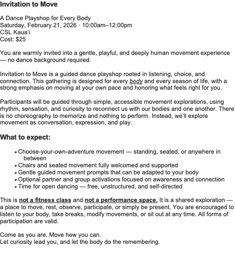 Invitation to Move is a guided dance playshop rooted in listening, choice, and connection. This gathering is designed for every body and every season of life, with a strong emphasis on moving at your own pace and honoring what feels right for you.